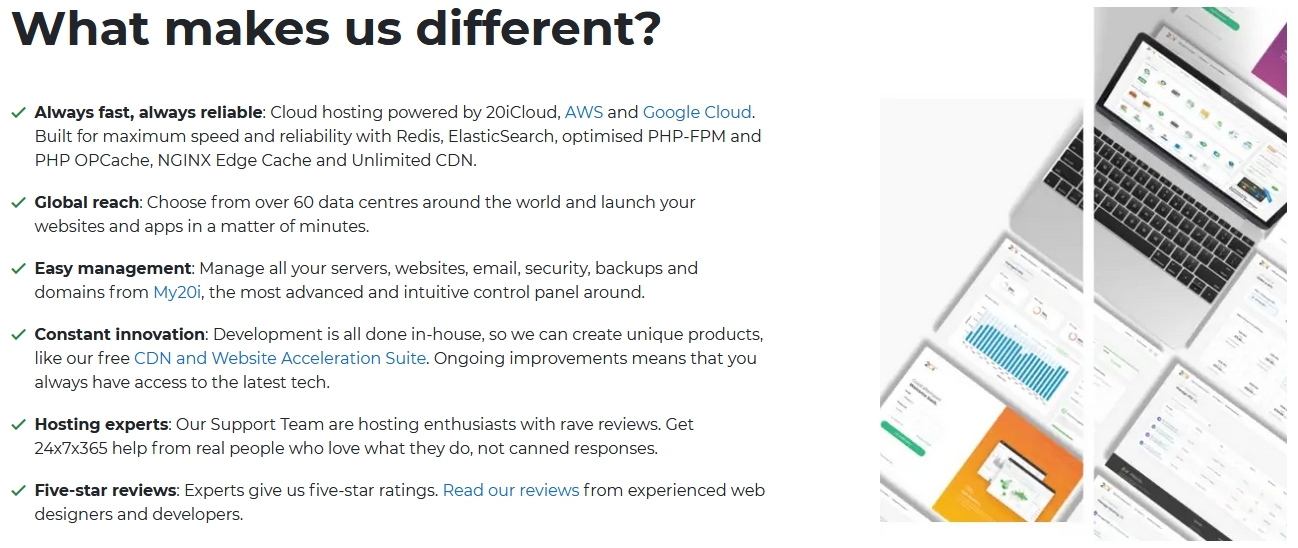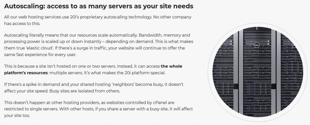 With the autoscaling cloud hosting infrastructure, 20i claims to be the fastest WordPress hosting platform. The real differentiator is that not all your WordPress packages are hosted on a single server, and they can be scaled up and down based on demand. In addition, since the website is not dependent on a single server, it will not go offline if the server is down. This feature is usually available with premium hosts, but 20i offers this to all customers.