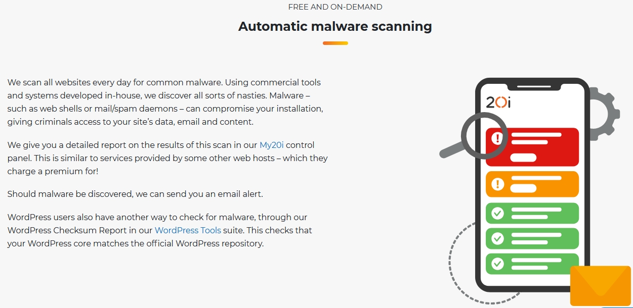 20i WordPress hosting is built to host and manage small to high-traffic websites. The hosting infrastructure is built with autoscaling functionality. So if your website starts to grow or has sudden spikes in traffic, 20i can manage that load easily. Not just optimized, the servers are built to withstand any malicious attacks with their DDoS protection and other robust network firewalls.