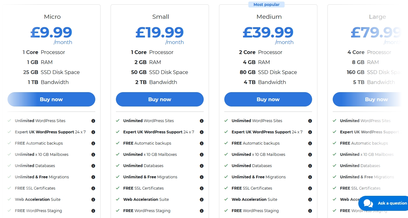 You can get 20i hosting for a starting price of $10.99 per month. For this price, you get hosting for unlimited WordPress Sites, 25 GB SSD Disk storage, 1 TB monthly bandwidth, free daily backups, SSL encryption, unlimited migrations, and a lot more.