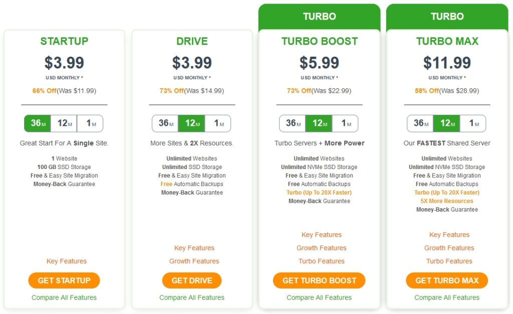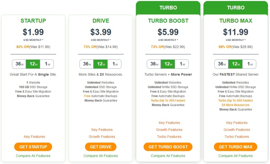 A2 Hosting’s Linux-based shared hosting packages are divided into four tiers: Startup, Drive, Turbo Boost, and Turbo Max.