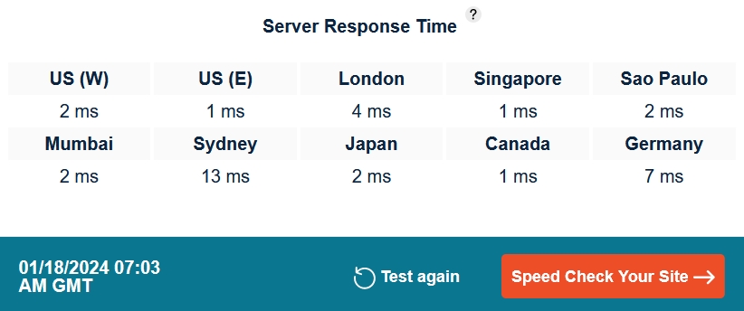 We used the Bitcatcha tool to check how long it took for the server to respond from various locations, like the United States (W), the United States (E), London, Singapore, and more. The max server response, which will shock you, was only 12 milliseconds.
